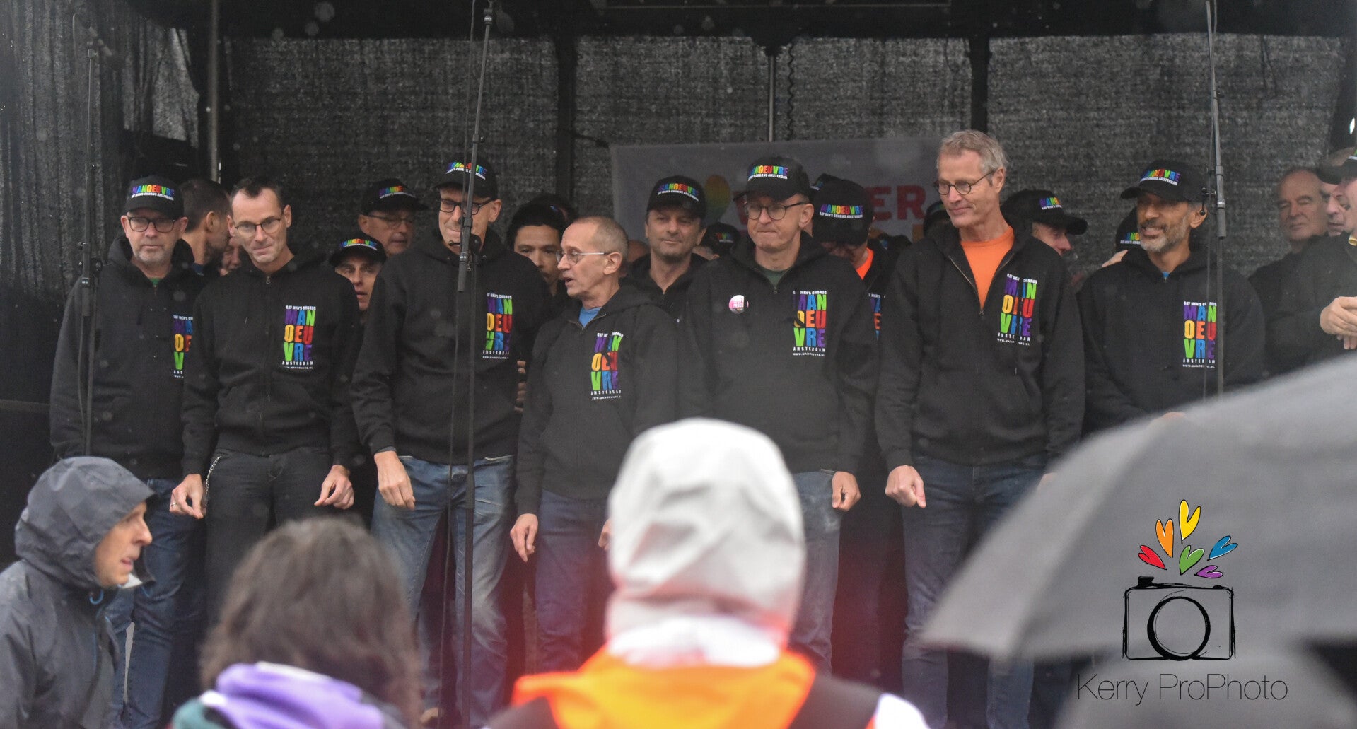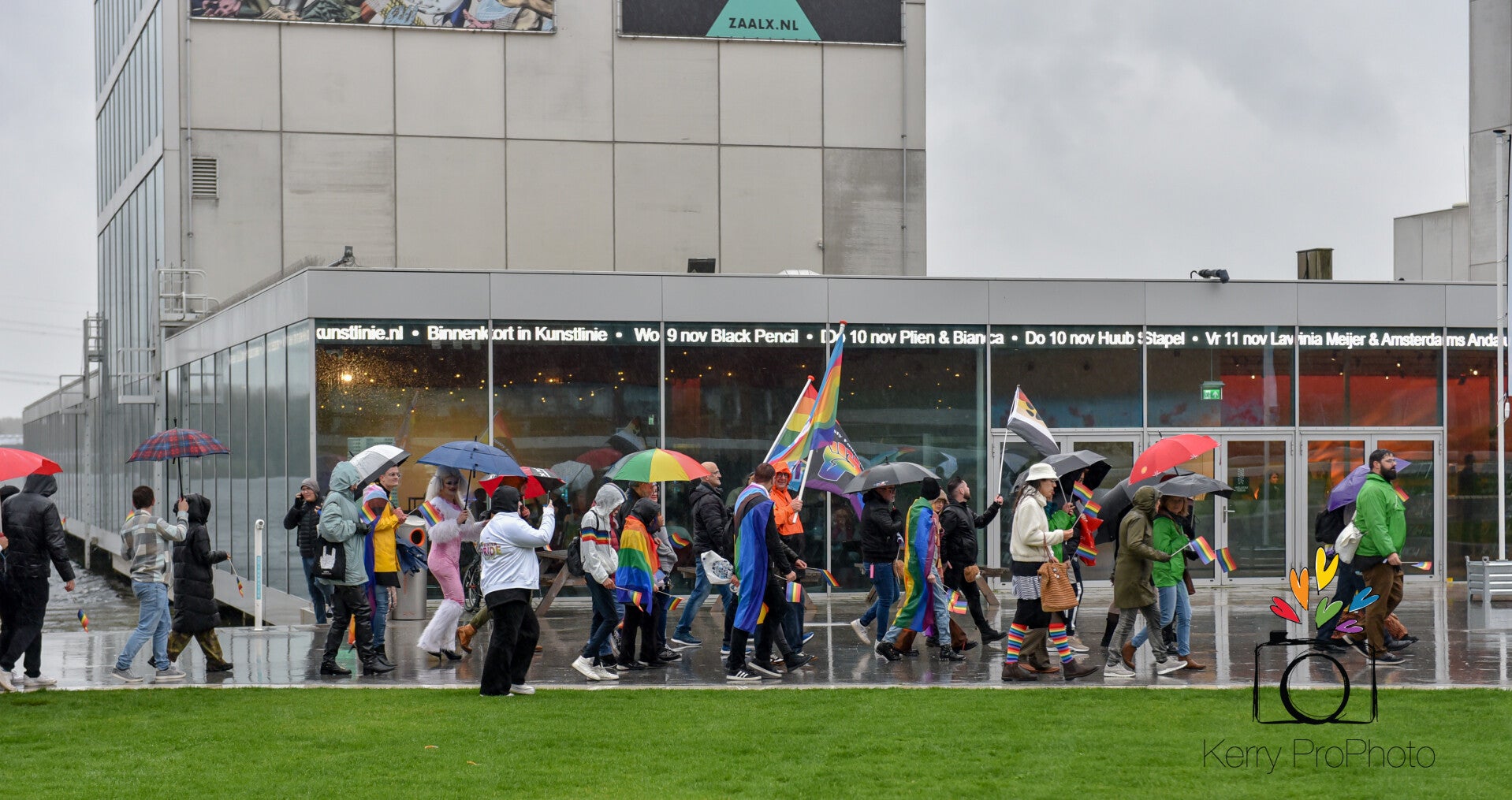 De Pride Walk startte met een openingsspeech door onze voorzitter Sem van Dijk. Daarvoor had gay choir Manoeuvre het doorweekte publiek al flink opgewarmd. Na de opening volgden onze sprekers, tweede kamerlid Lisa van Ginneken, wethouder Maaike Veeningen, Shanella Bleecke en een gesprek met Tanja Jess over haar rol als trans ouder met ons bestuurslid Claire Slingerland. Na de inspirerende en persoonlijke verhalen welke duidelijk maakten waarom we de Pride nog zo hard nodig hebben volgde de walk door het centrum van Almere.